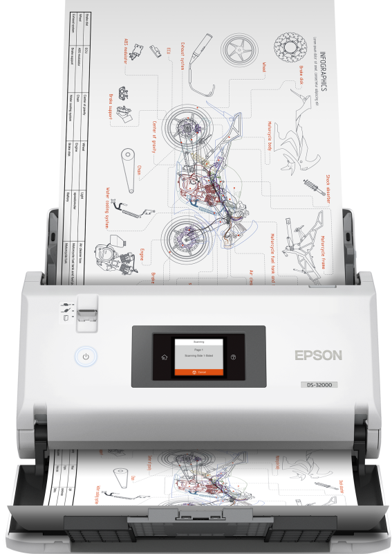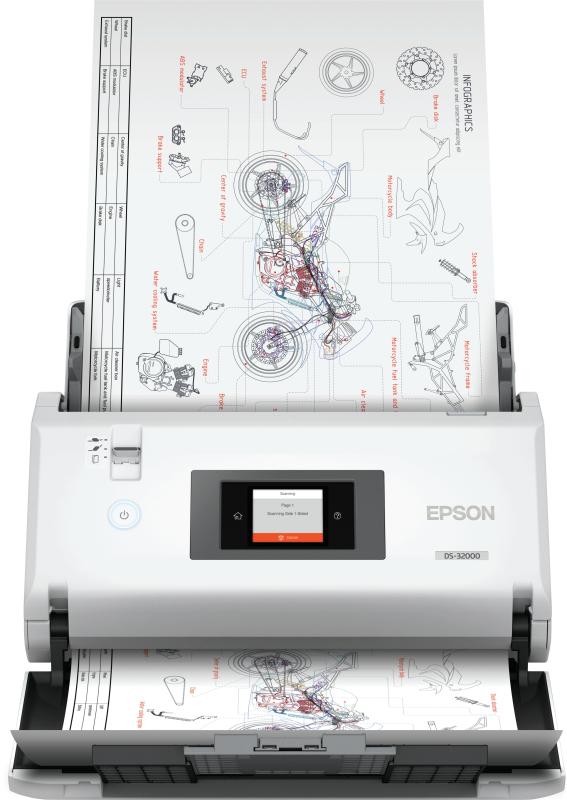 Scanner Epson WorkForce DS-32000, dimensiune A3, tip sheetfed, viteza scanare: 90 ppm mono si color, ADF 120 coli, rezolutie optica 600 X 600dpi, duplex, senzor CIS, tehnologie LED, Scanare catre BMP, JPEG, TIFF, multi-TIFF, PDF, searchable PDF, secure PDF, PDF/A, JPEG(Colour/Greyscale), PNG, docx, xlsx, pptx, Software inclus: Epson Document Capture (Mac only), Epson Document Capture Pro (Windows only), Epson Scan 2, Volum scanare: 40000 pag/zi, interfata: USB 3.0.